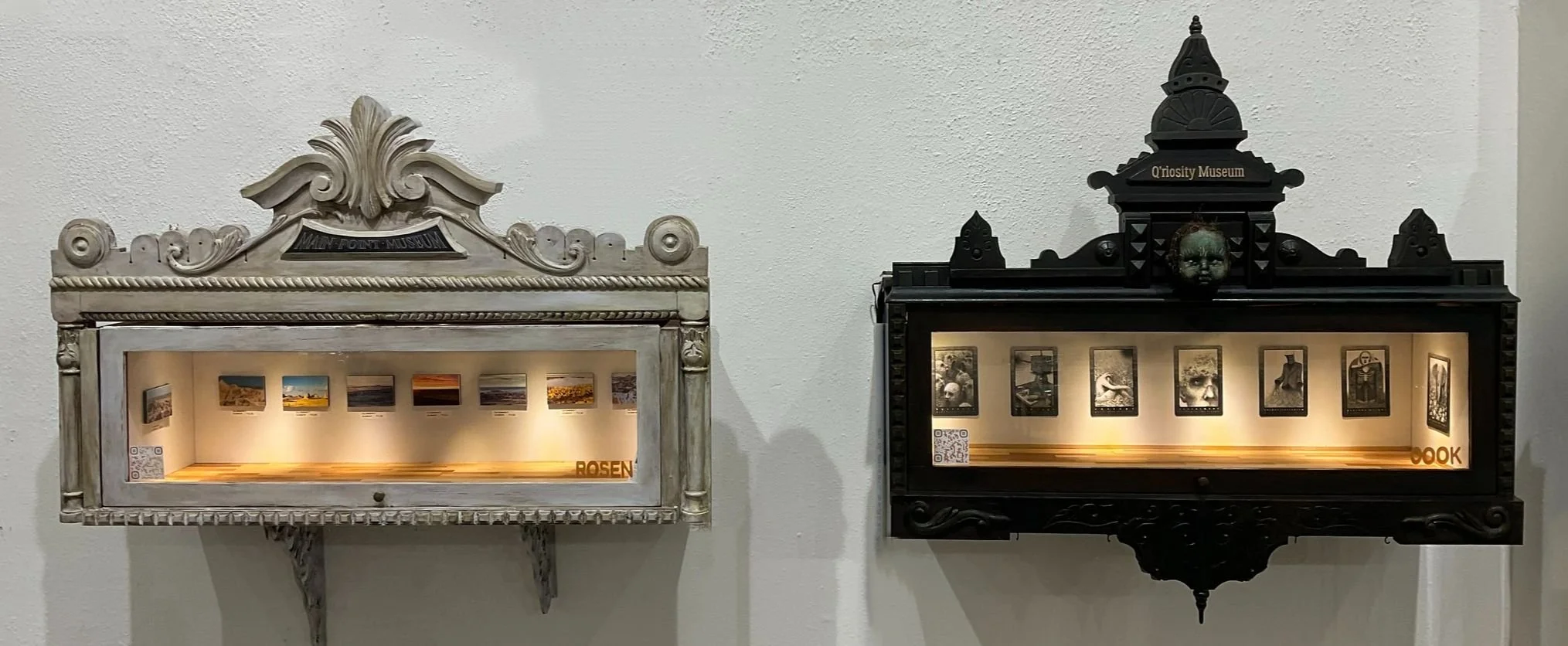 The Main Point Museum (left) and the Q’riosity Museum (right) sprang from the imagination of local artist and Gallery Q member Diane Canfield Bywaters. She constructed them out of two old barrister’s cabinets with glass front doors, adding pieces of trim from vintage mirrors and other architectural details. Each has been outfitted with real wood plank floors and LED lighting, mimicking the larger space of Gallery Q. The Main Point Museum, painted white, has recently featured paintings by Diane, photographs by Robert Rosen, and currently, mosaics by Erin Prais-Hintz.